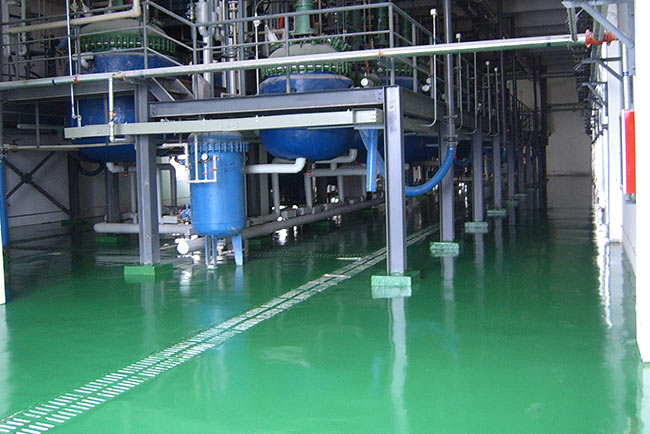 医药厂除了对地坪的洁净度和美观度的要求较高外,对地坪的抗渗性、耐腐蚀性的要求也较高。2012年,在做双鹭药业时,我们选用了进口耐腐蚀固化剂,保证地坪颜色经酒精擦拭不变色。在边角部位和水沟部位,加了玻璃纤维布防渗漏。所以,使用几年后,地坪还是很美观耐用。